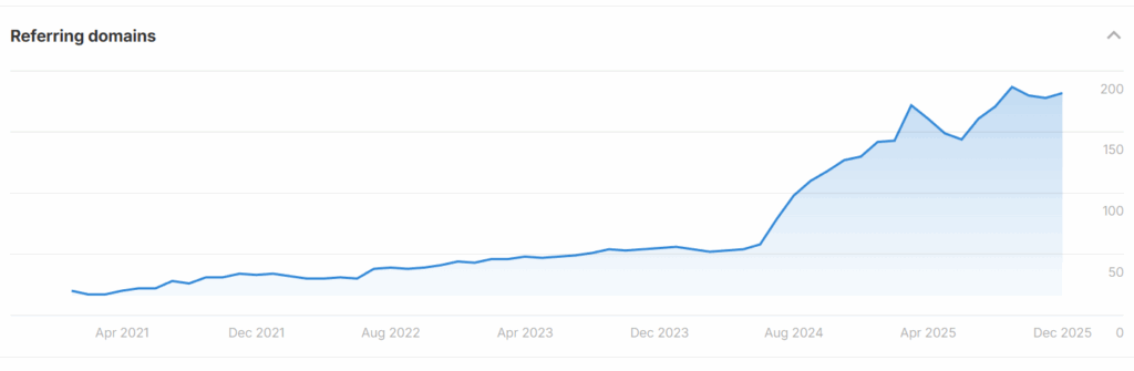 Robinson & Hadeed’s backlink profile has grown substantially since joining the Matador Co-Op in June 2020. At that time, their site had just 29 referring domains – by December 2025, that number had climbed to 182, representing a 527% increase. This growth reflects our ongoing commitment to building quality backlinks month after month, a steady effort that has strengthened their domain authority and contributed to improved search visibility.